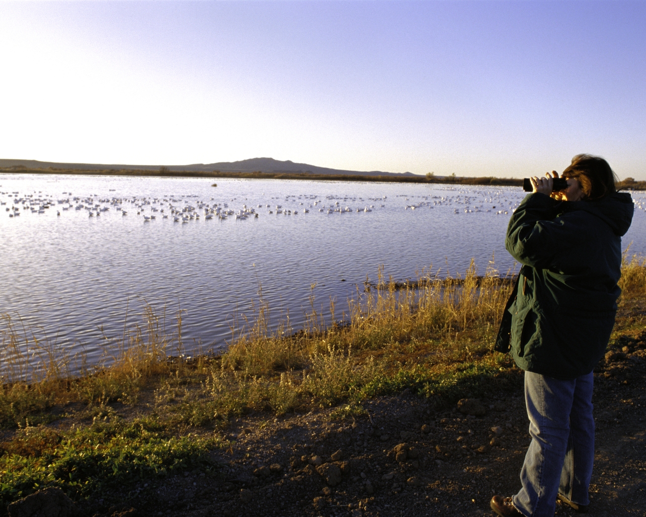 Woman looks through binoculars to observe waterfowl and other wildlife at Bosque del Apache National Wildlife Refuge in Socorro, New Mexico.