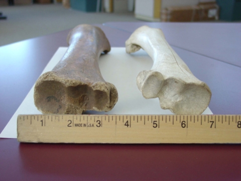 Close view with measurement of brown Bison bone compared in size to corresonding white domestic cattle bone.