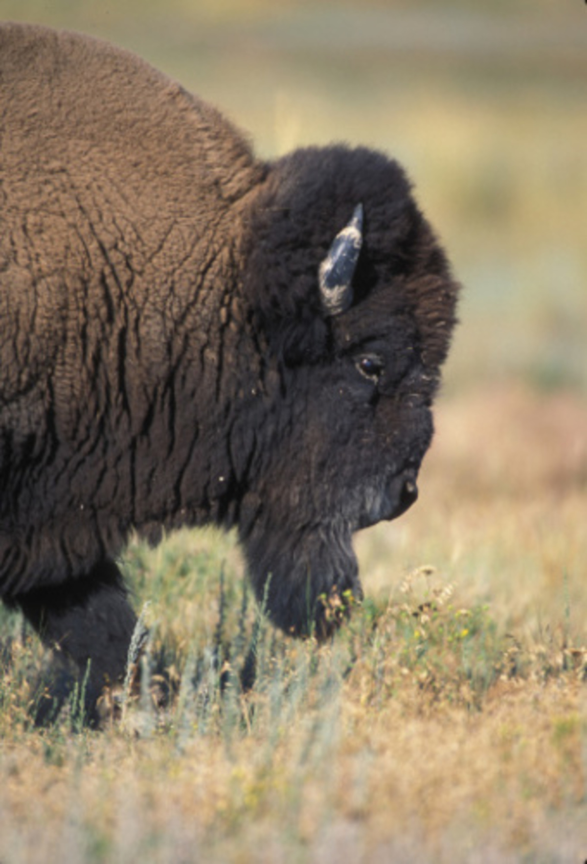 Close-up profile of front half of buffalo bull. Vertical. Resource links:http://www.fws.gov/bisonrange/nbr/