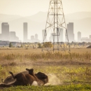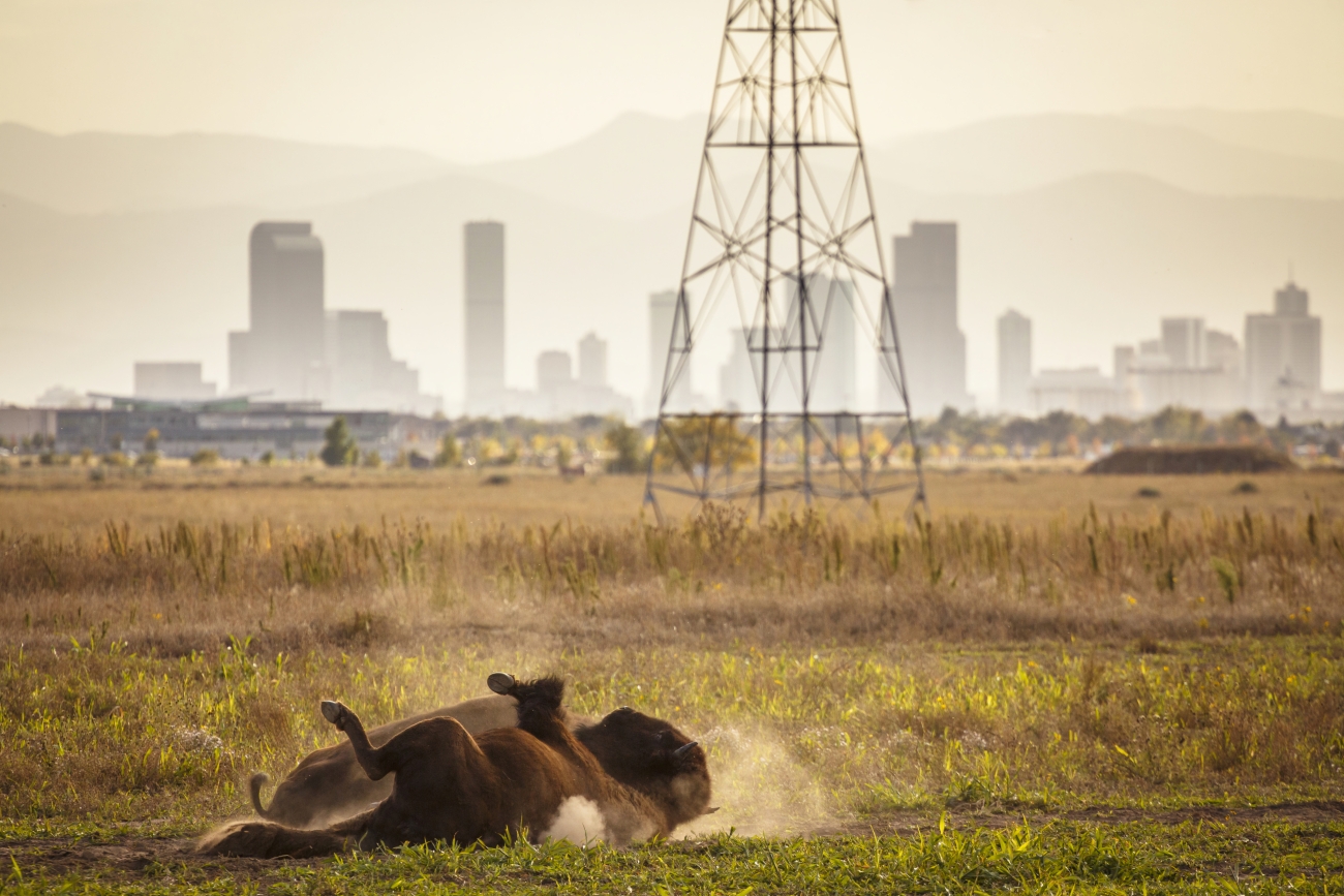 Bison roll on the ground at Rocky Mountain Arsenal National Wildlife Refuge with the city of Denver in the background.