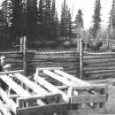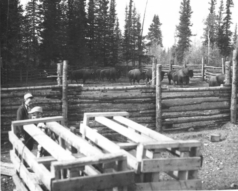 Big Delta, Alaska. "Bison transplanting operations. Bison waiting to be crated." Bison released in Slana.