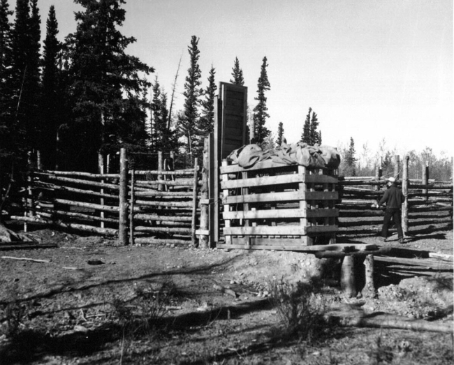 Big Delta, Alaska. "Trap door up, crate in place, ready to drive bison in crate." Bison released in Slana