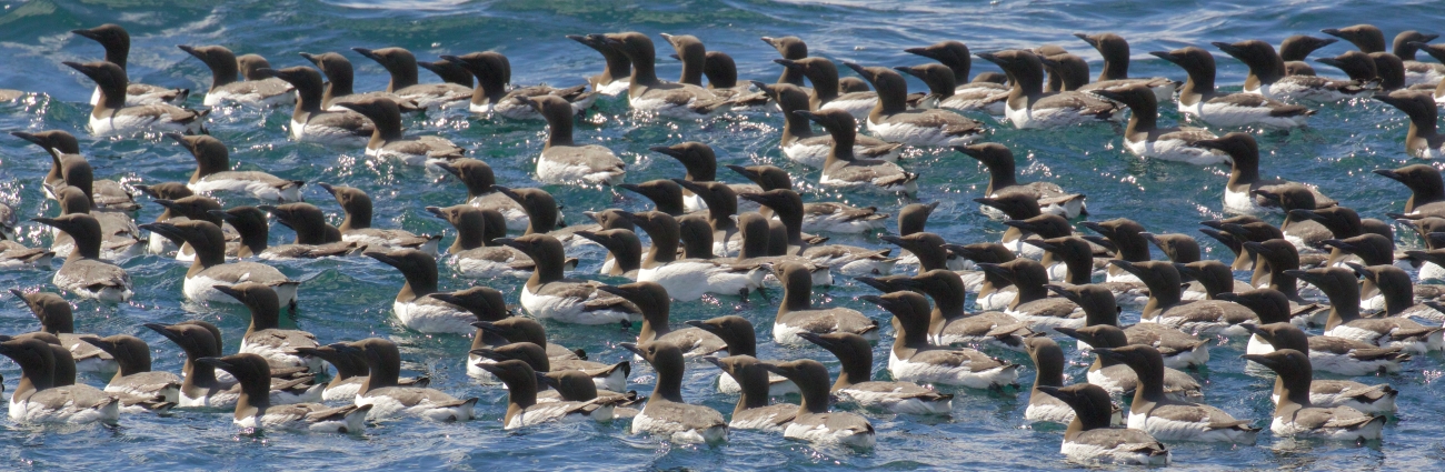 Murres float on the sea near an island breeding colony on the Alaska Maritime National Wildlife Refuge