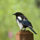 Black-bellied magpie standing on wood post AT Kenai National Wildlife Refuge.