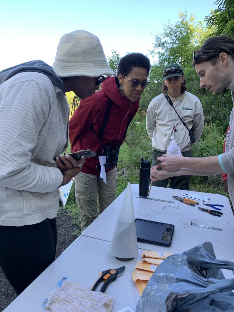 Birders examine how band is placed on a bird's leg