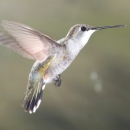 Black-chinned Hummingbird is a small hummingbird (3–4 g), slender in appearance with a broad reddish bill, black at tip. photographed in a yard west of Patagonia, SCC, Arizonia.
