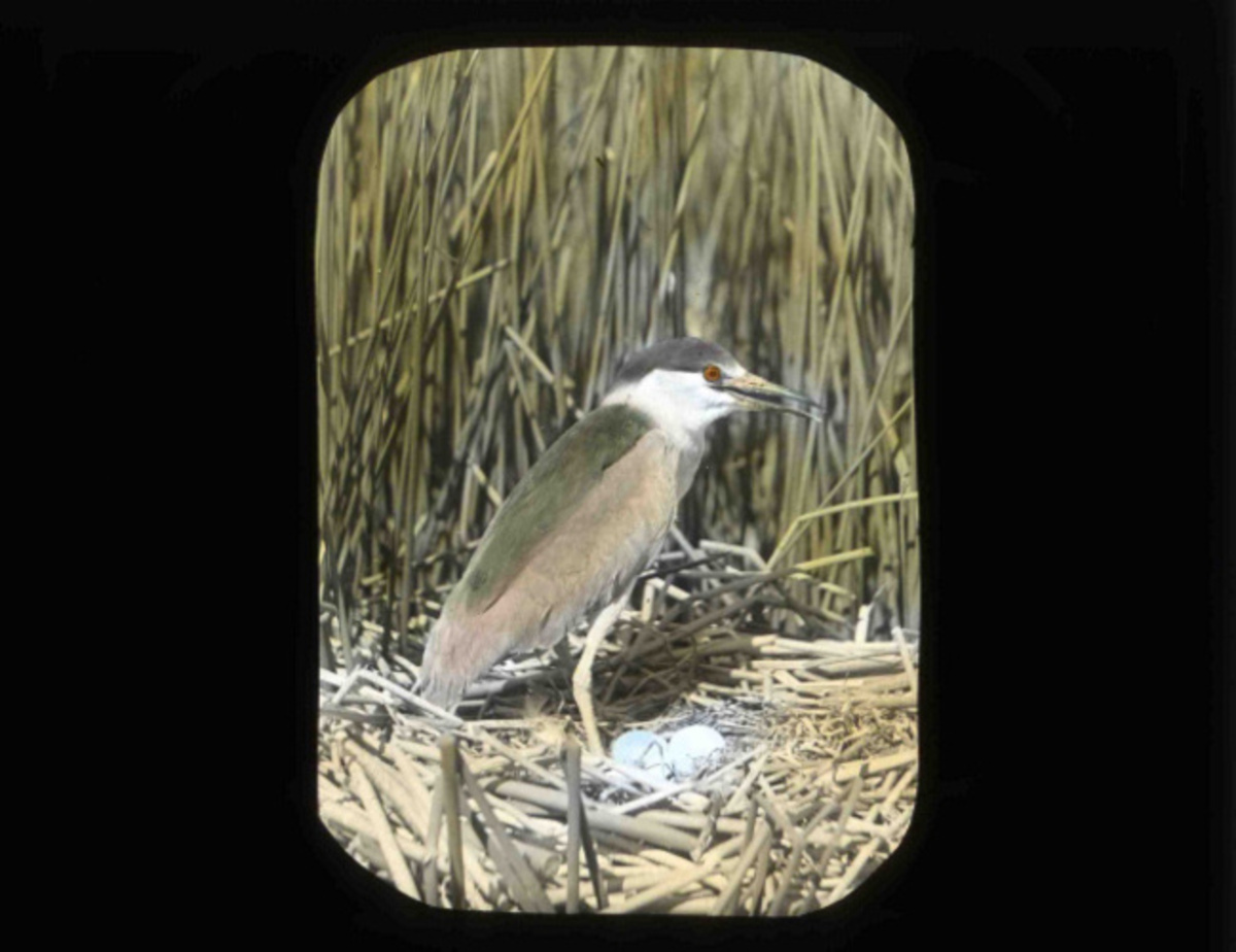 A Black-crowed Night-Heron guarding its nest and eggs while Finley and Bohlman capture a shot at Malheur lake in 1908. Malheur lake would later become a bird refuge in 1908 when President Roosevelt saw photography Finley and Bohlman did of that area in 1908.