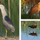 Black-crowned night heron (Nycticorax nycticorax) standing tall and alert; American bittern (Botaurus lentiginosus) along the bank; and White-faced ibis (Plegadis chihi) stalking its prey in shallow waters. Photo Credit: Sandra Uecker/USFWS