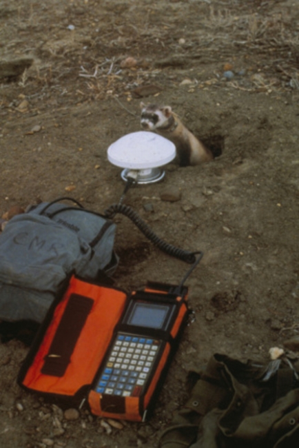 Black-footed ferret at borrow entrance investigating scientific equipment laying on ground. The black-footed ferret is one of the most endangered mammals in North America. For more information about the status of black-footed ferrets visit http://ecos.fws.gov/species_profile/servlet/gov.doi.species_profile.servlets.SpeciesProfile?spcode=A004