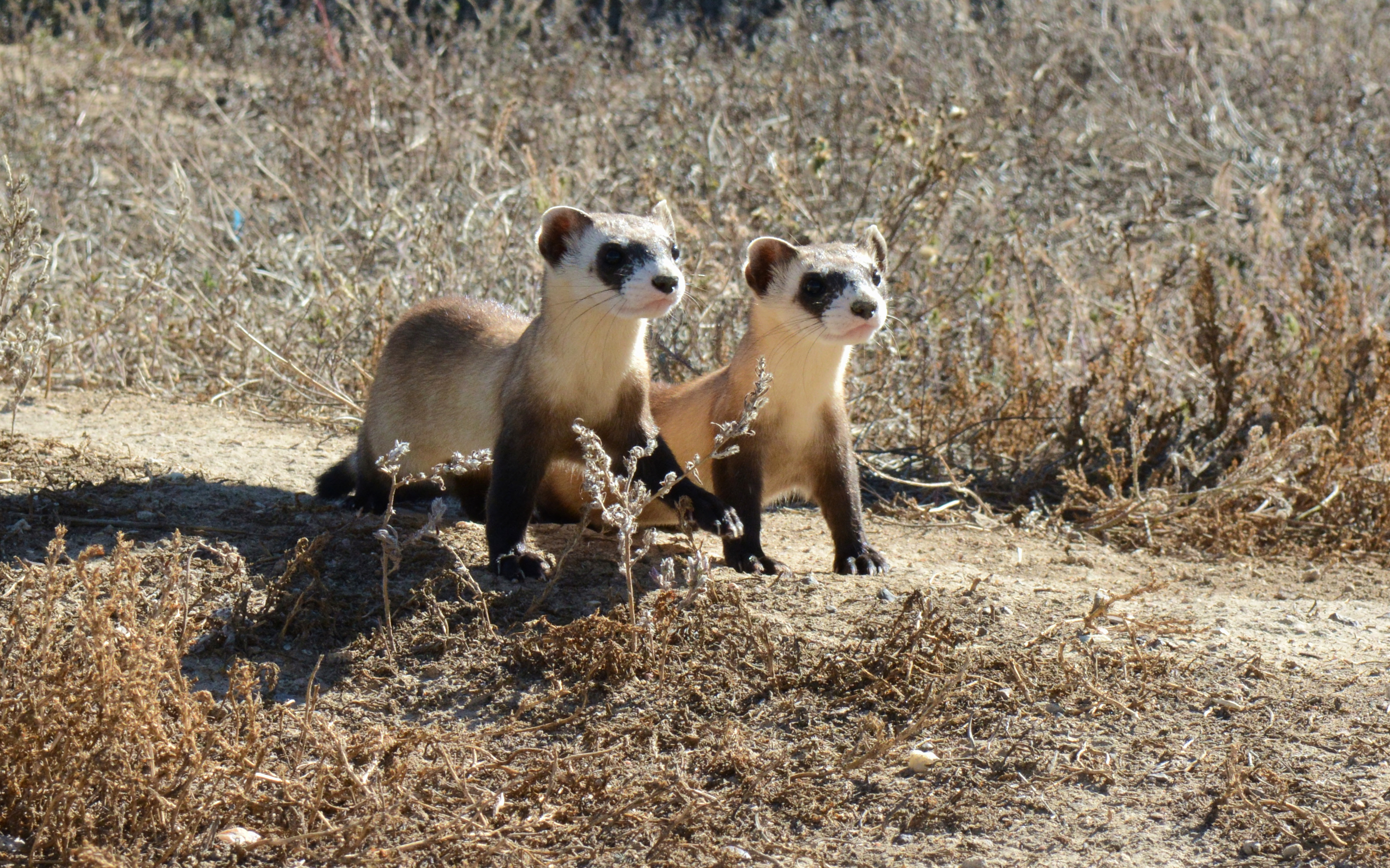 A curious pair of Black-footed Ferret kits survey the short grass prairie from their outdoor enclosures at the National Black-footed Ferret Conservation Center in Colorado.