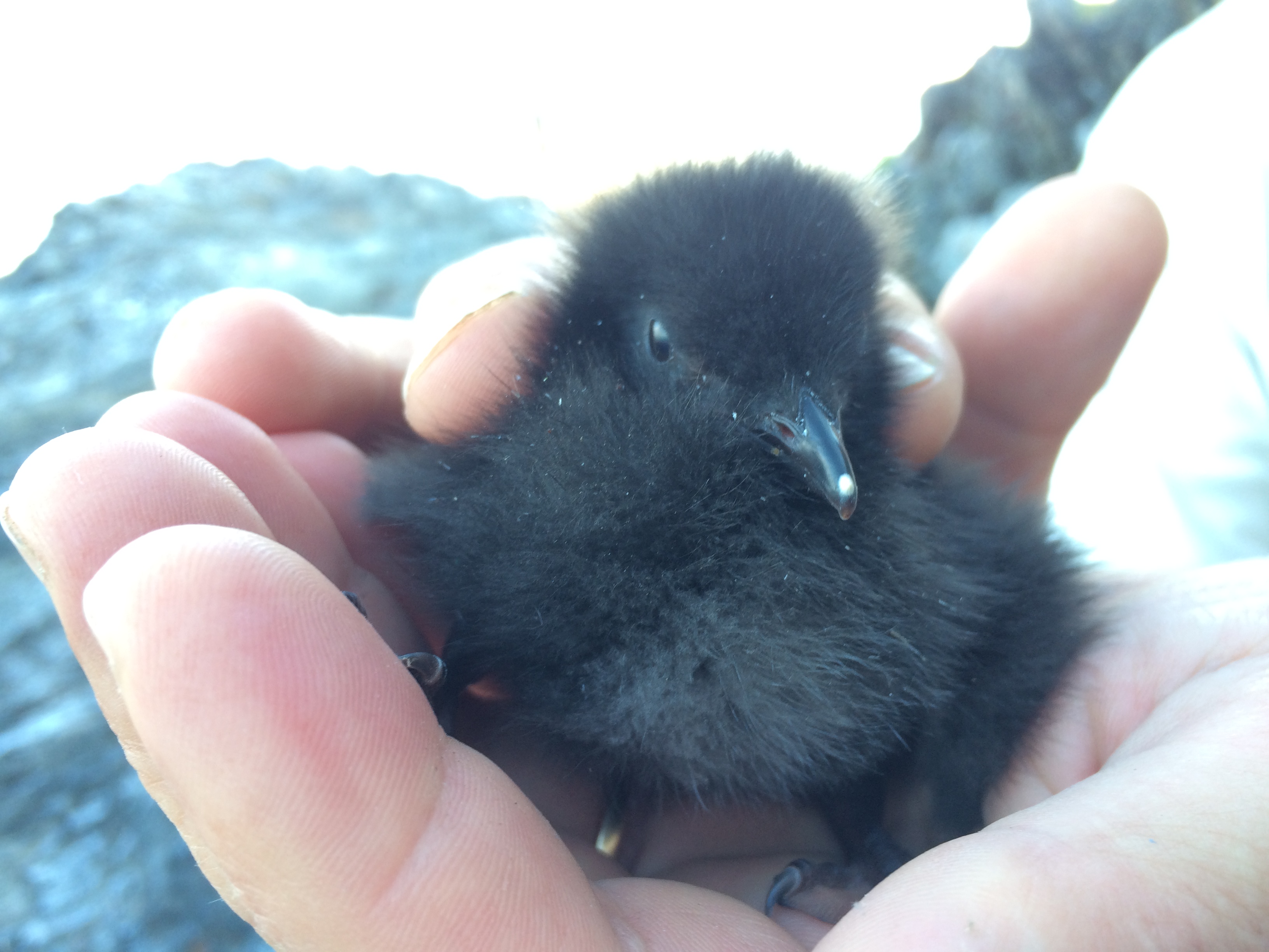 Black guillemot chick being held on Outer Green Island, Casco Bay, Maine.
