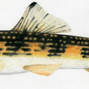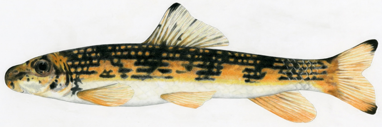 Illustration representative of species group for fish identification. The Black jumprock, Moxostoma cervinum, rocky riffles and runs of creeks and small rivers