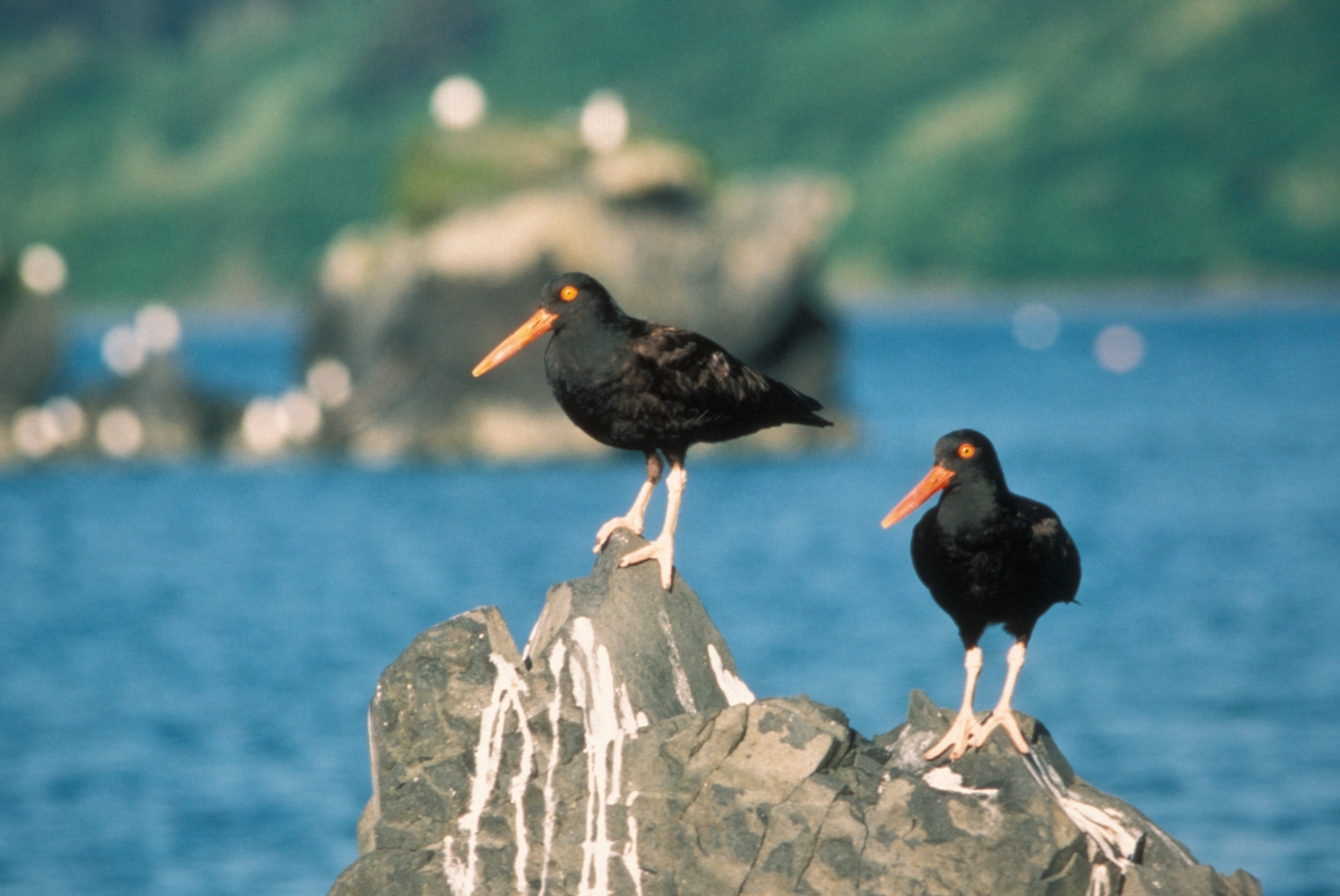 July 1985, Kodiak Island, Alaska Maritime National Wildlife Refuge, Two oysters catchers standing on rocks with water in background.