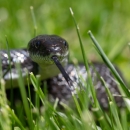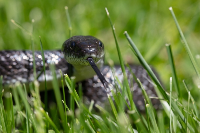 Black snake on the defense. They will mimic venomous snakes by "rattling" their tail.