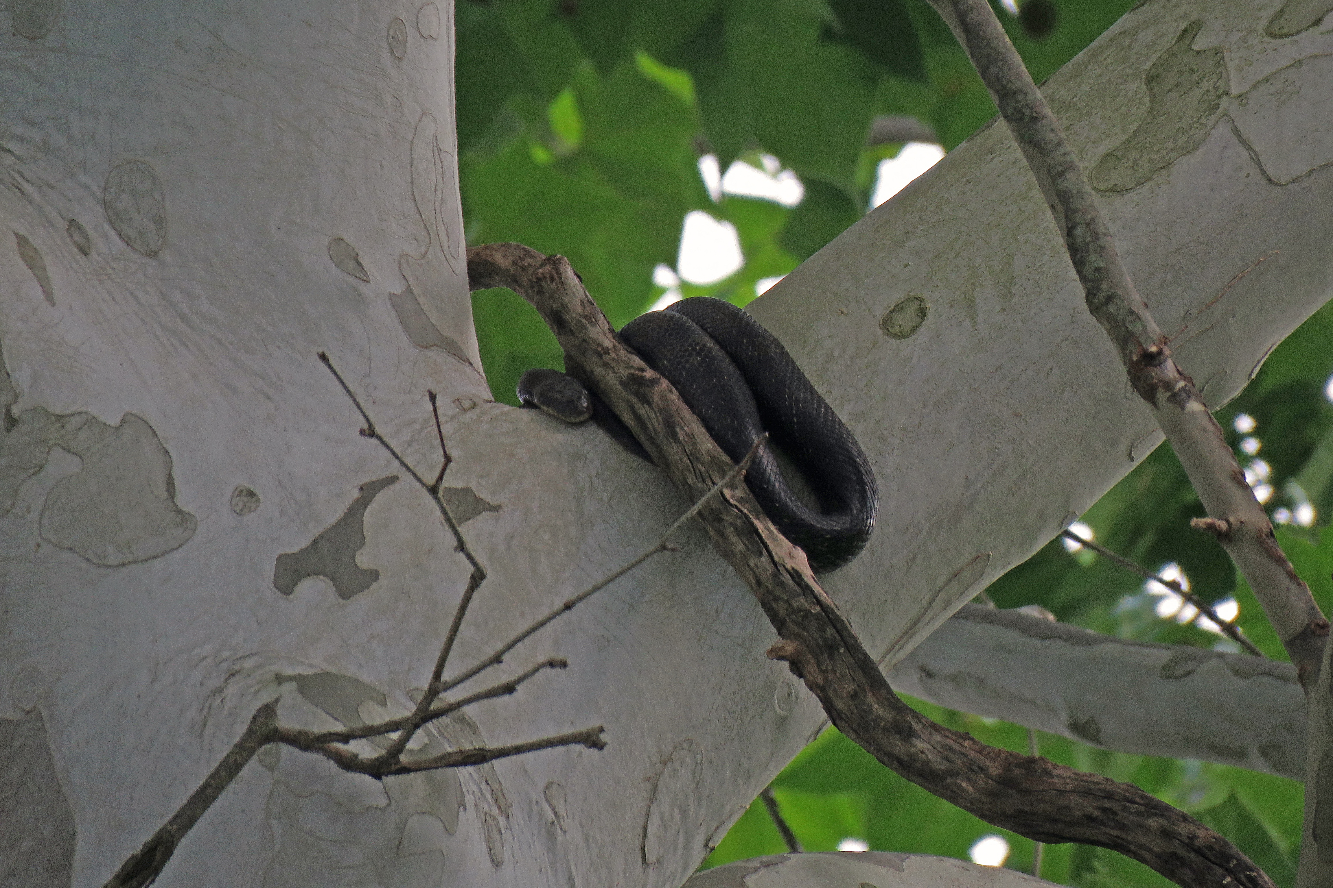 The Black rat snake was about 35 feet up in a Sycamore tree in the middle of the National Conservation Training Center campus. It uses a knot in the trunk in the same immediate region of the tree for temporary shelter.