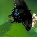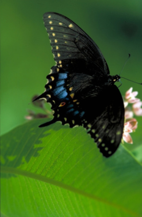 Also called Spicebush swallowtail; Black butterfly with small blue and yellow spots sitting on blossom with wings open, viewed from above.