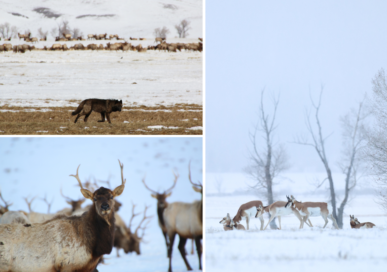 Various pictures of wildlife in the snow at National Elk Refuge including a black wolf, group of elk, and several pronghorn sheep. Photo Credit: Kari Cieszkiewicz/USFWS