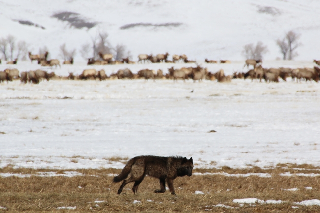 Black wolf searching for ground squirrels. Herd of elk in background at National Elk Refuge