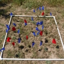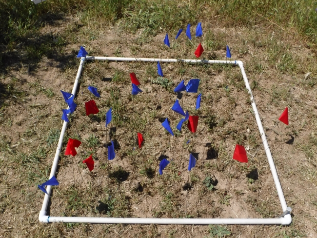 Spineflower seeding study plot with colored flags marking spineflower plants that have initiated flowering (blue) or are already in flower