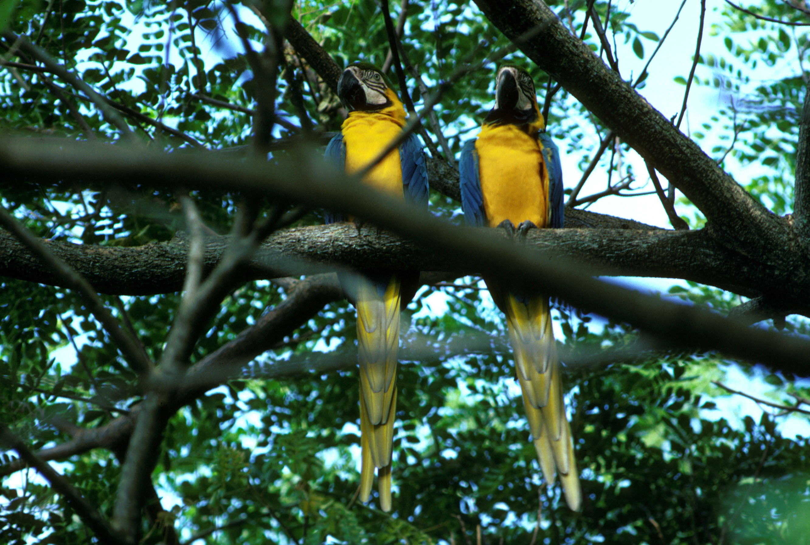 Two blue and yellow macaws perched on a tree branch side by side. Tobago; W.I. Psittaciformes. Cousins in the parrot family