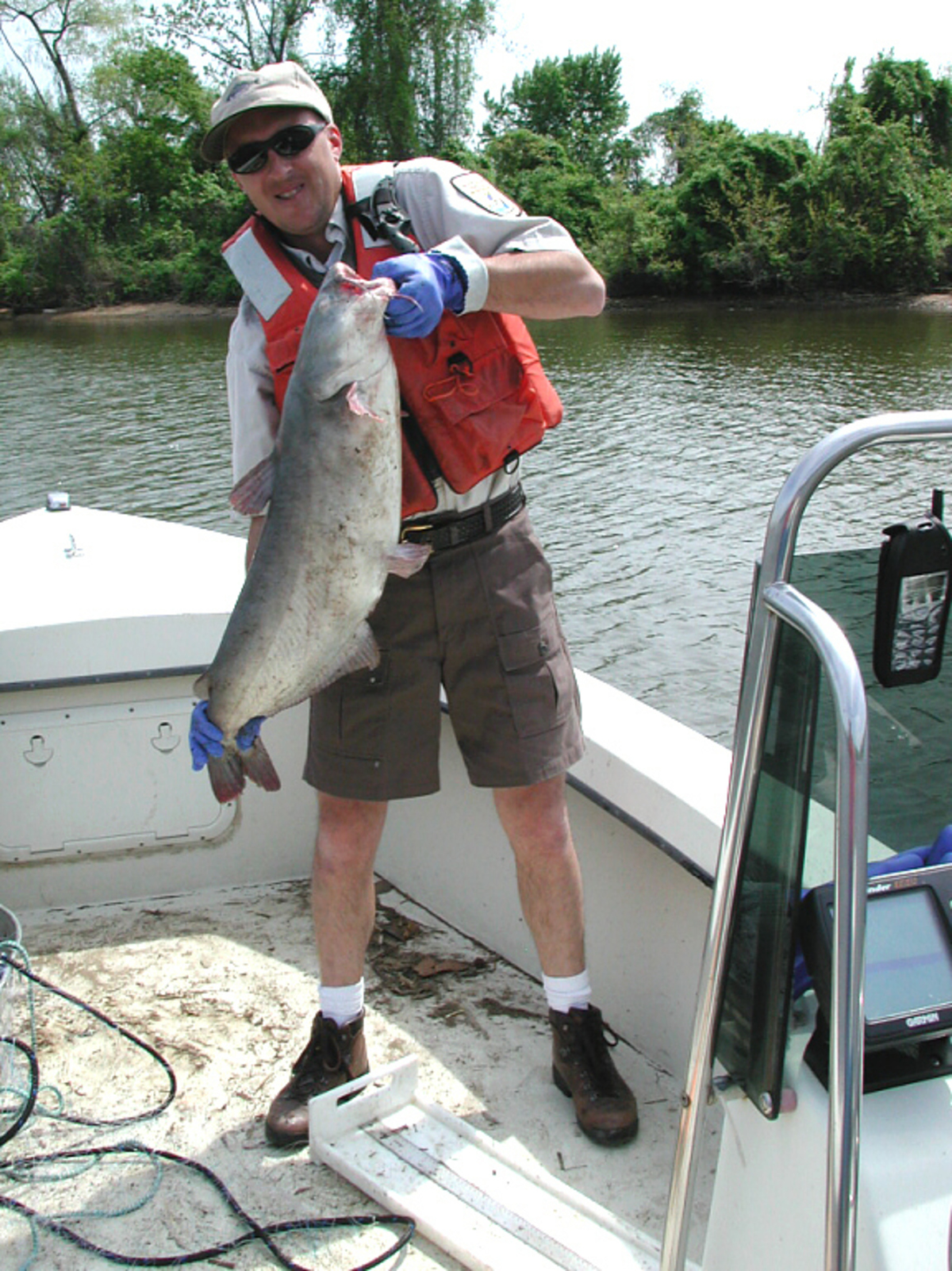 Mike Mangold with blue catfish at Dyke Marsh,Virginia. Fisheries management; Fishing; Wildlife management; Electronic