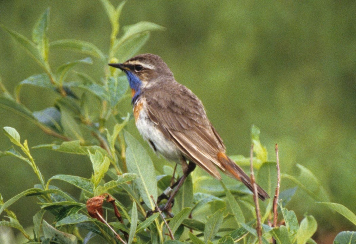 The Bluethroat is one of the smallest members of the Thrush family measuring 5.5 (14 cm) inches in length. The colorful blue throat pattern distinguishes this breeding male from other species. Nests are found on the tundra in thickets near water. The Blue