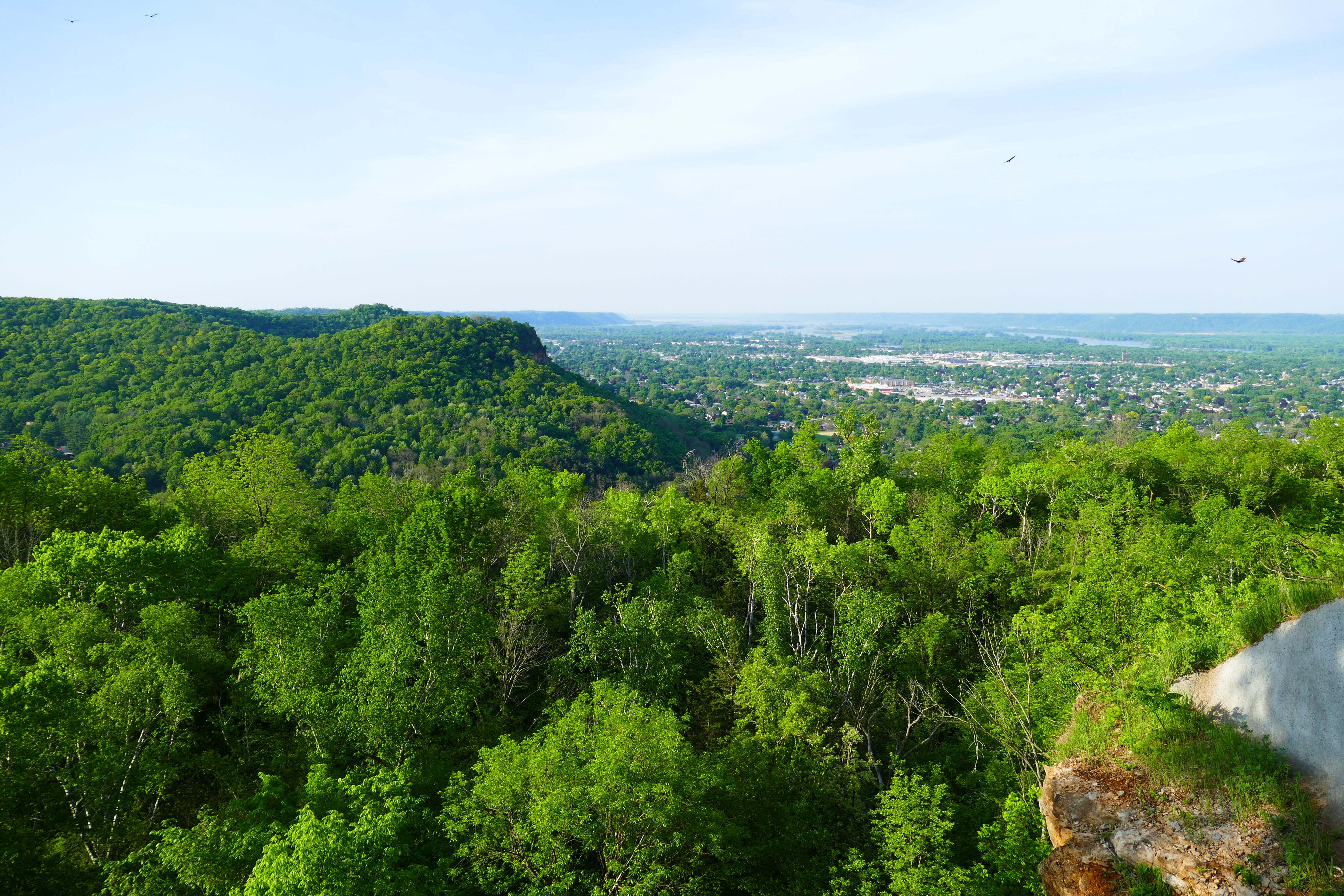 Bluff with green foliage with La Crosse in the distance.