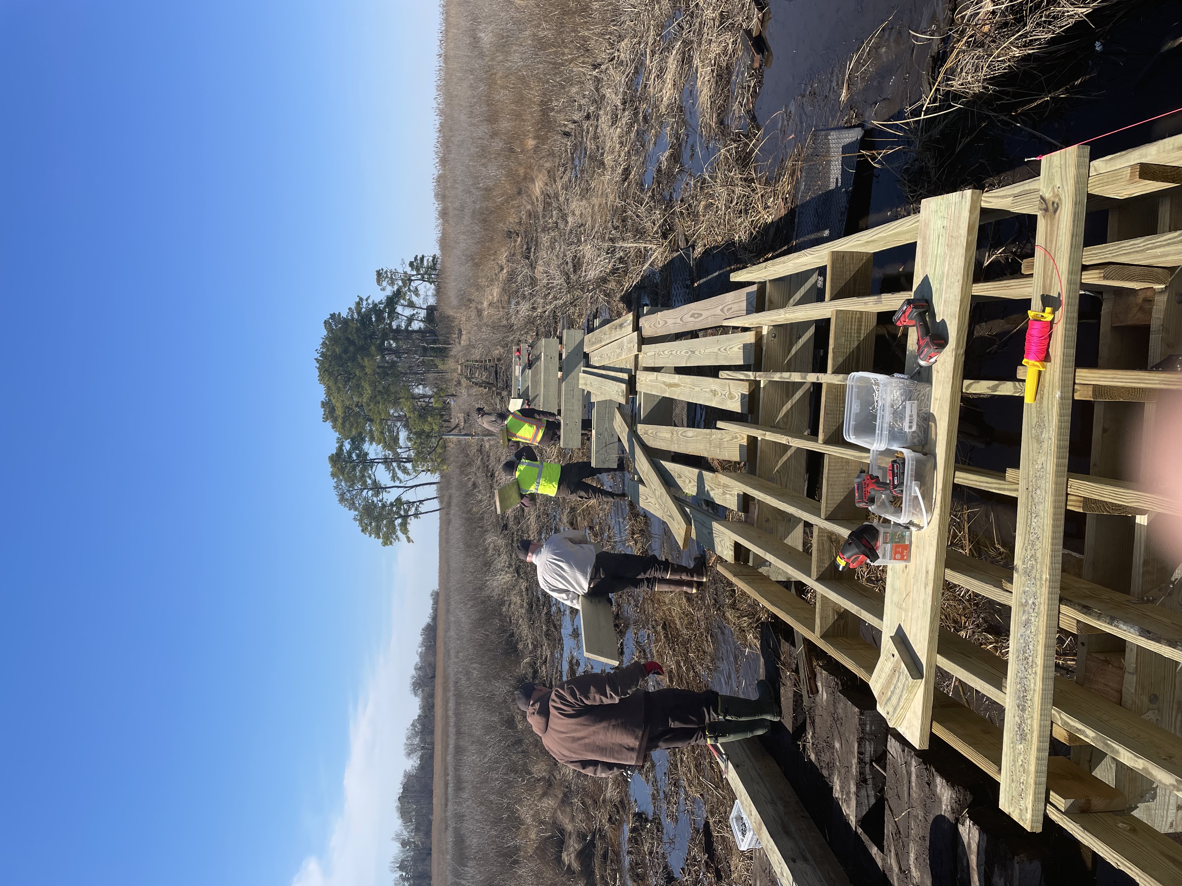 Construction of the Tubby Cove Boardwalk in 2022-23 at Eastern Neck National Wildlife Refuge on Maryland's Eastern Shore, a Great America Outdoors Act infrastructure improvement project. Maintenance professionals from across the Fish and Wildlife Service cooperated on the project.