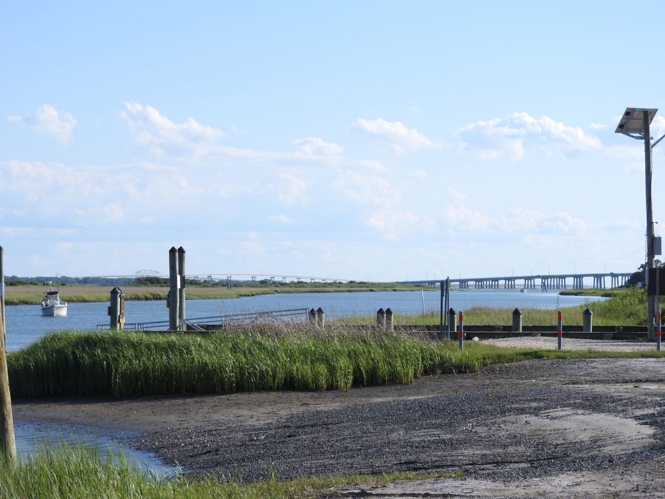 Boat launch with view of Chesapeake Bay Bridge and tunnel from Eastern Shore of Virginia NWR. Located on the Virginia Inside Passage, the Wise Point boat ramp provides access to the Atlantic Ocean and Chesapeake Bay.