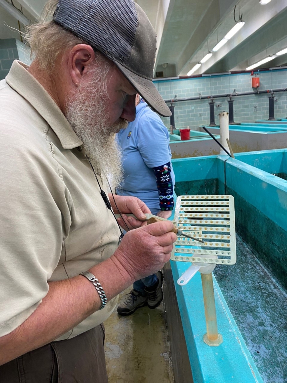 Biologist Bob Clark processes an egg shipment at Wolf Creek National Fish Hatchery.