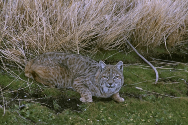 Bobcat crouched beside dried vegetation near road. Bobcats are medium-sized cats and cousin to the lynx. Their coat varies in color from shades of buff or brown fur with spotted or lined markings in dark brown or black. Their habitat varies from forests and mountain areas to semideserts and scrub areas. They prey on rabbits, rodents and occasionally deer. They are declining in numbers due to habitat loss.