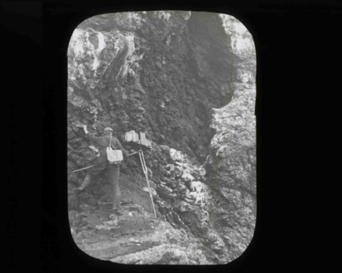 Herman Bohlman climbing Three Arch Rocks cliffs in order to photograph a pigeon guillemot nest in 1903. Finley and Bohlmans photgraphs of the area in 1903 would later help Three Arch Rocks become the west coasts first bird refuge in 1907.