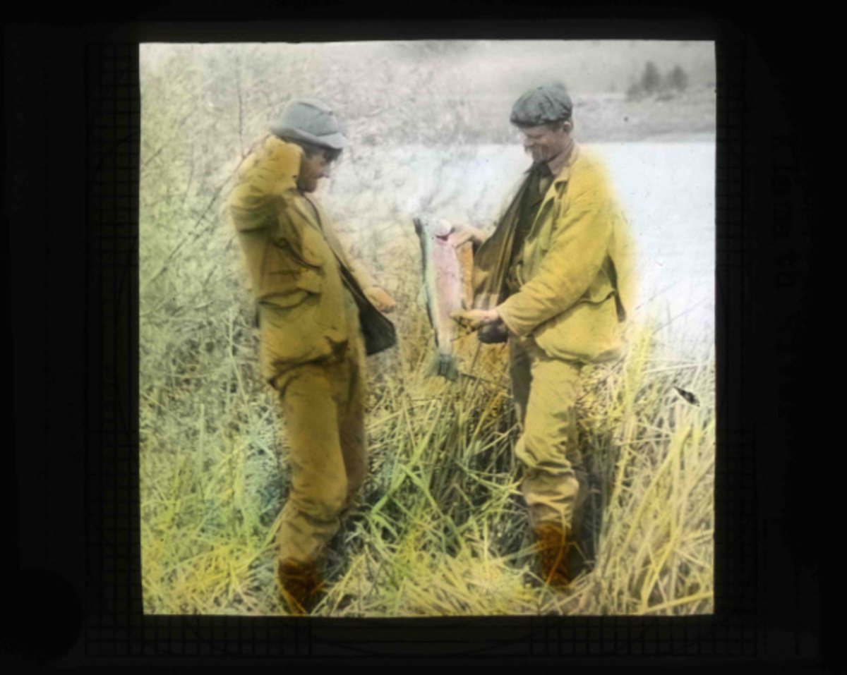 Bohlman showing off this rainbow trout to Finley during thier 1905 photography trip to Klamath Marsh. Finley and Bohlman's photography of the area in 1905 would later help Klamath become a bird refuge in 1908.