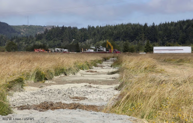 The spoils from boring under the river to place the electrical transmission lines underground are being used to fill drainage ditches. Image taken from USFWS Pacific Region Flickr page.
