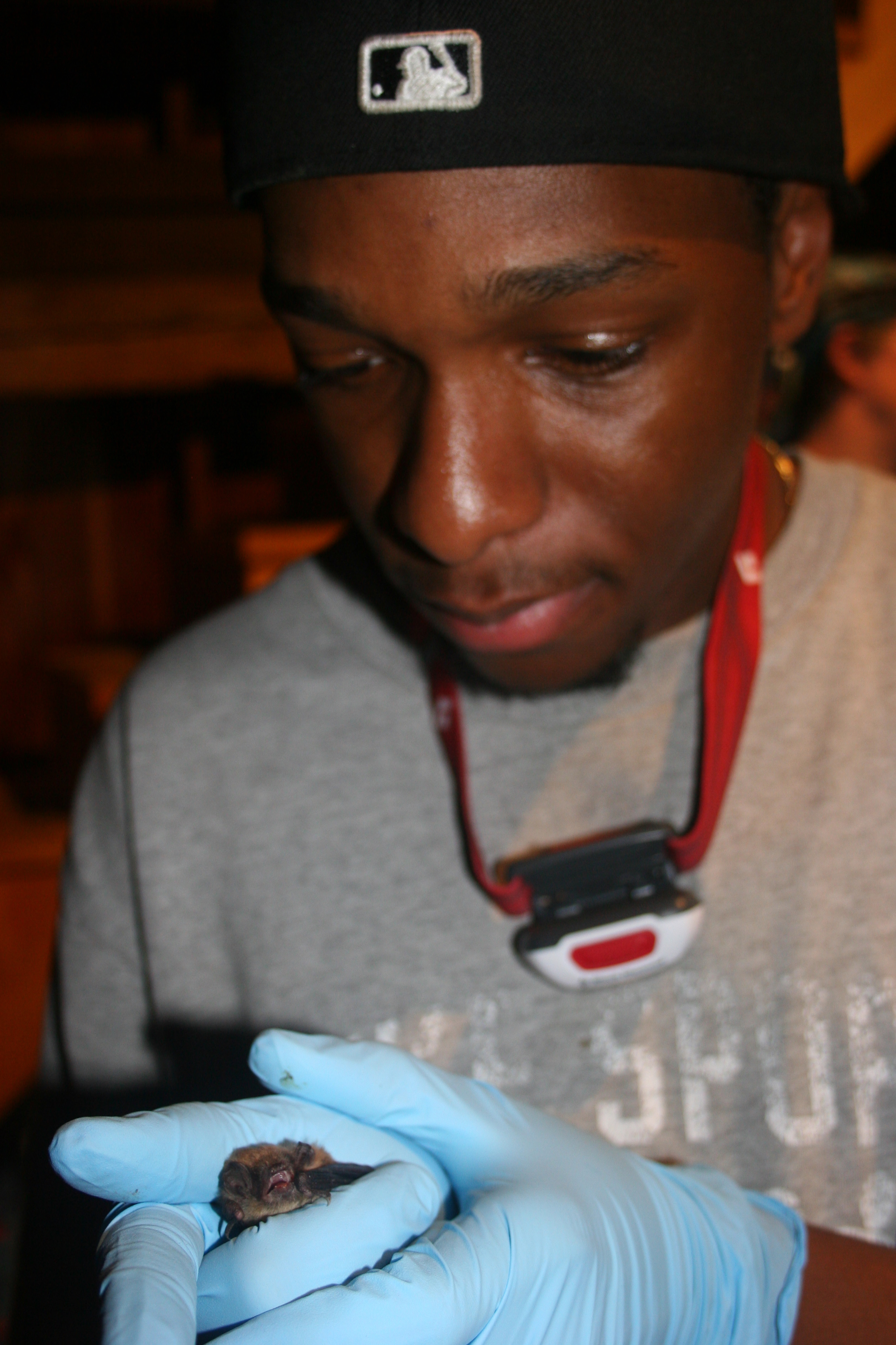 Boston University technician, Leon Spencer, holds recently banded bat.