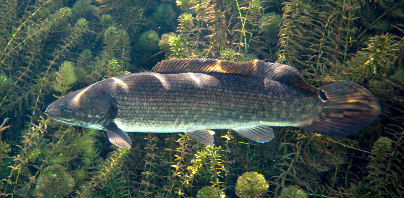 Bowfin are native to North America and the fish most commonly mistaken for snakeheads. Note the short anal fin on the bottom closest to the tail and dot on the tail.