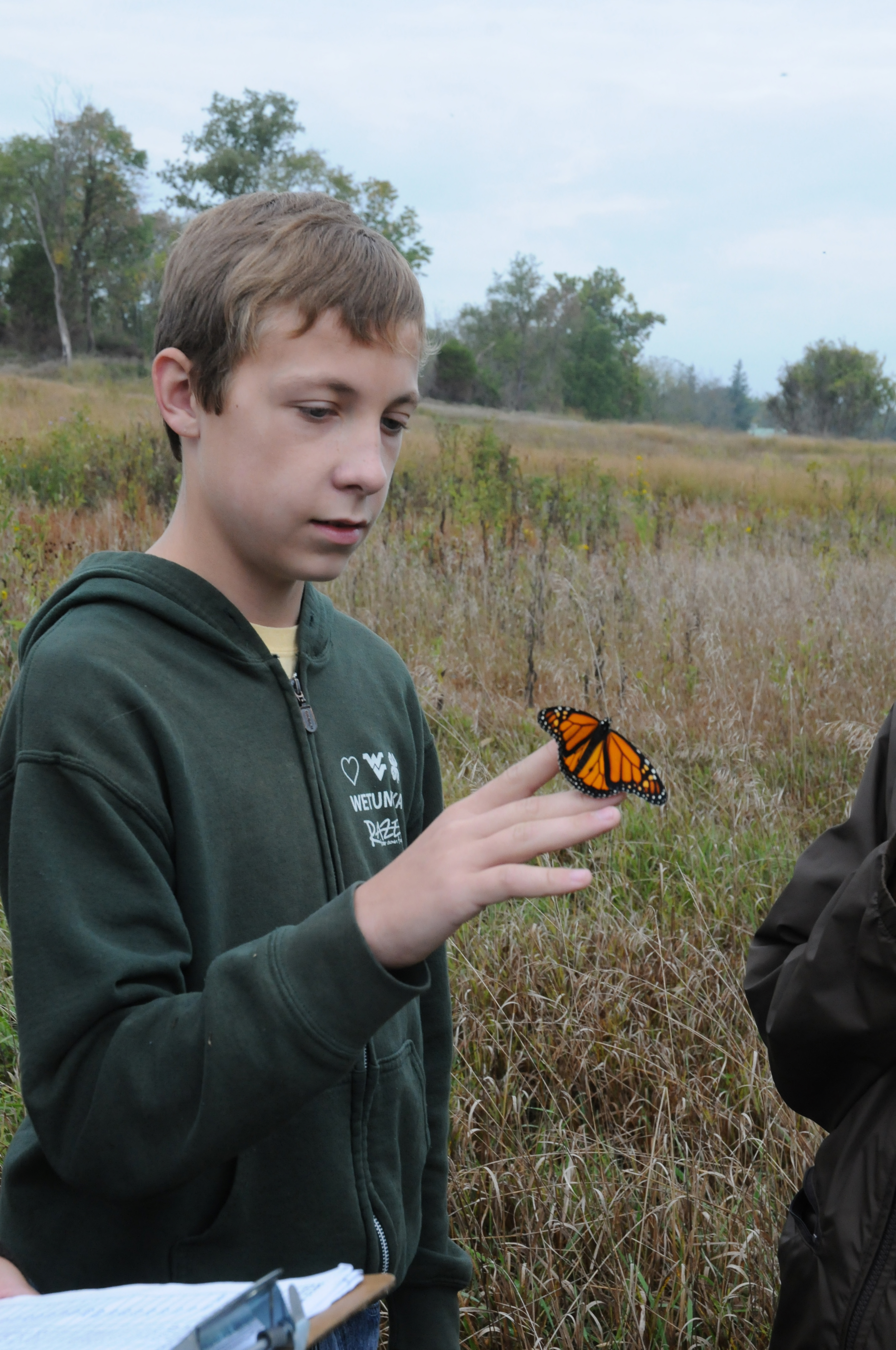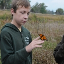 A young male holds a Monarch butterfly on his finger. Photo release #7.