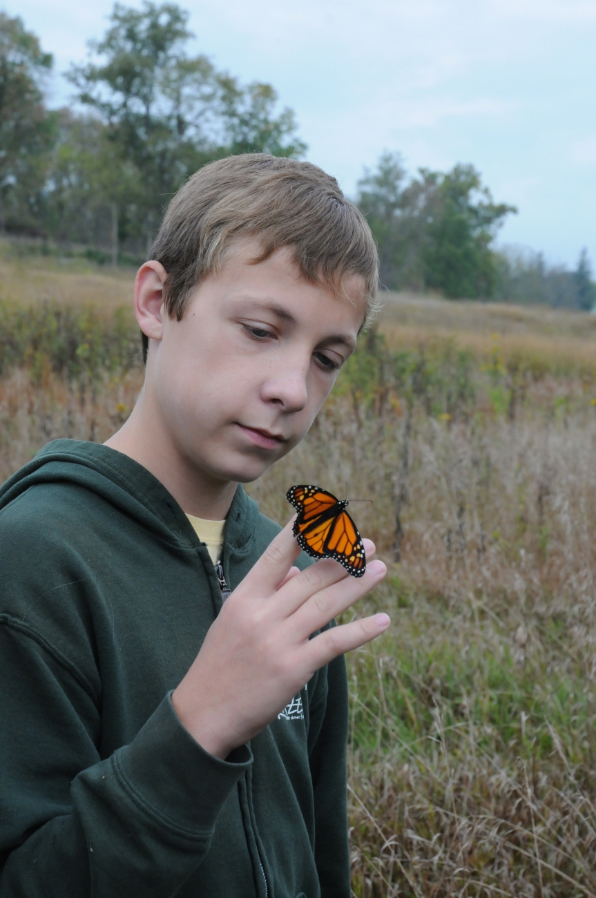 A young male holds a Monarch butterfly on his finger. Photo release #7.