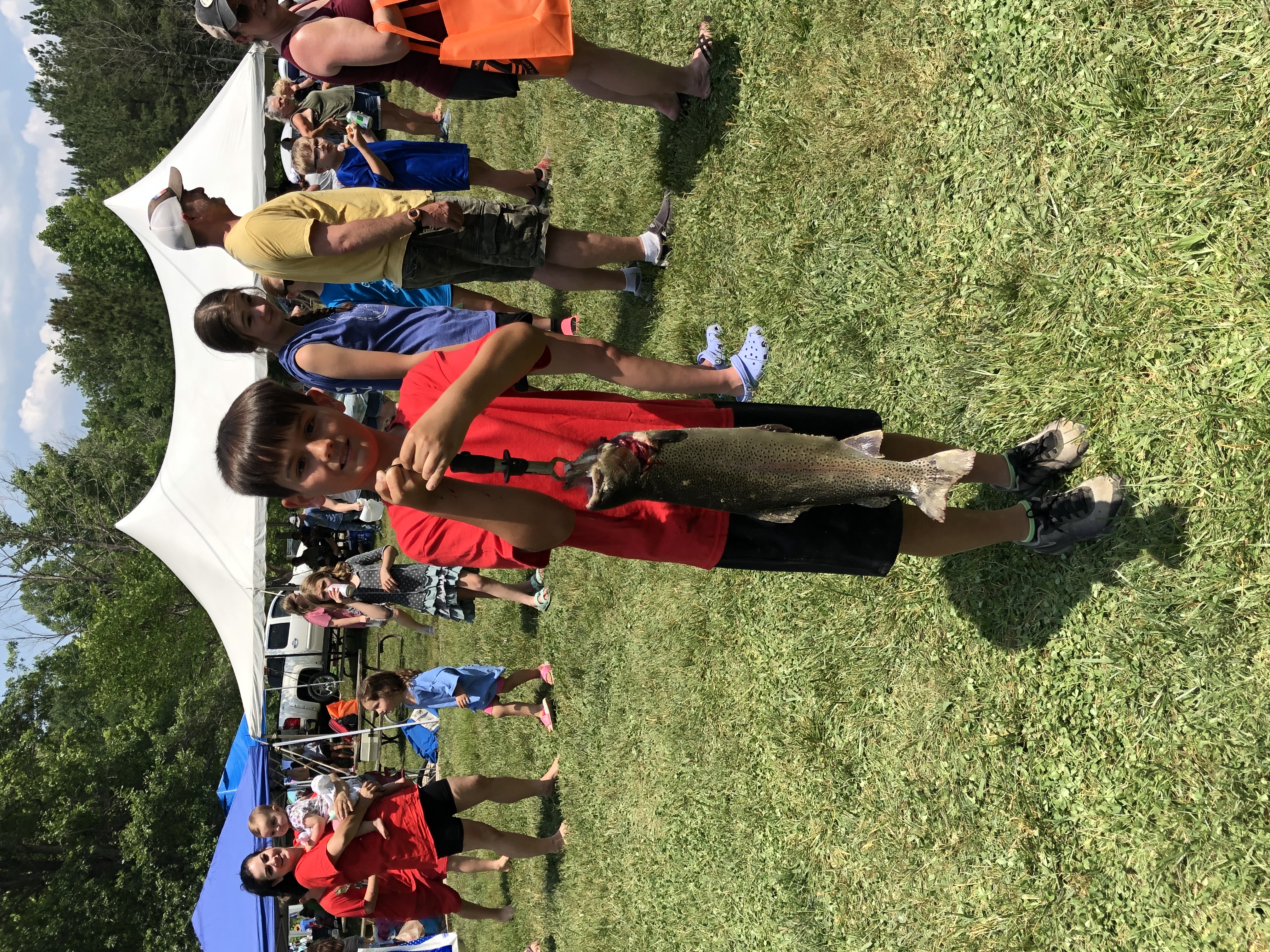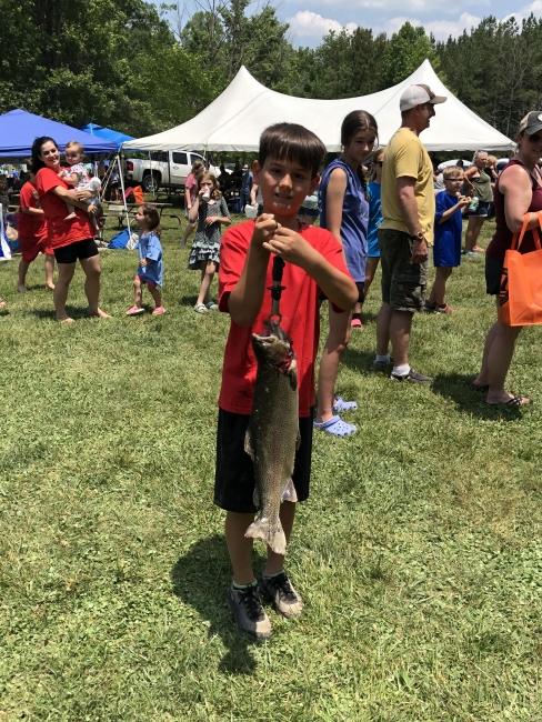 A participant of the 35th Annual Catch A Rainbow Kids Fishing Derby at Wolf Creek National Fish Hatchery holding his large Rainbow trout caught in Hatchery Creek.