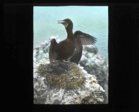 Hand painted glass slide of a Brandt's Cormorant at its nest in Three Arch Rocks. Taken by Finley and Bohlman during a 1903 photography trip to the area that would later help Three Arch Rocks become the first bird refuge on the west coast in 1907.