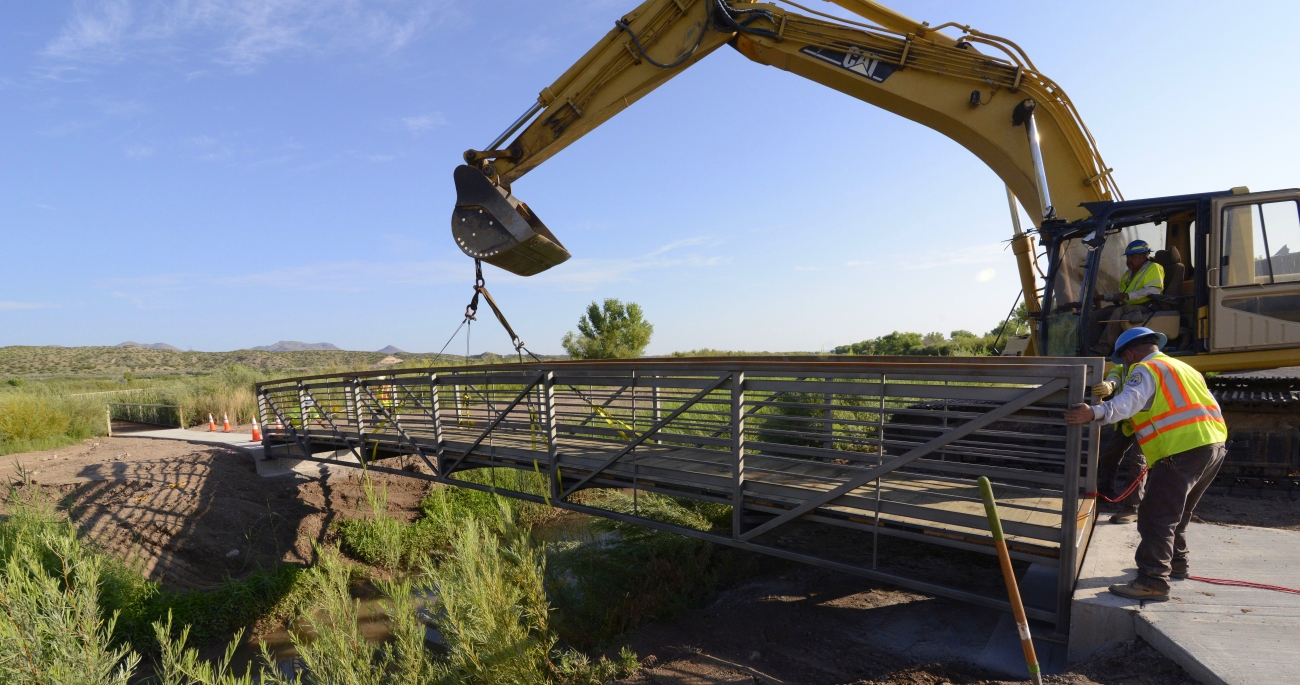 A heavy equipment team lowers a bridge into place at Bosque del Apache National Wildlife Refuge in New Mexico.