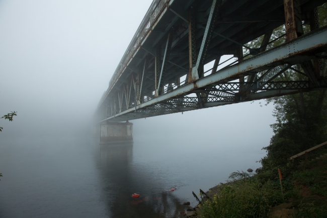 A foggy morning view of the bridge over the Allegheny River.