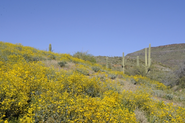Brittlebush and saguaro cacti cover this hillside in the Sonoran Desert on the Cabeza PrietaNational Wildllife Refuge.