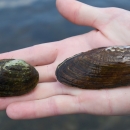 These two native specimens were pulled from the Potomac River during a survey near Shepherd's Island, MD. Of the two, the mollusk on the left - a Brook Floater, is considered a "species of concern".