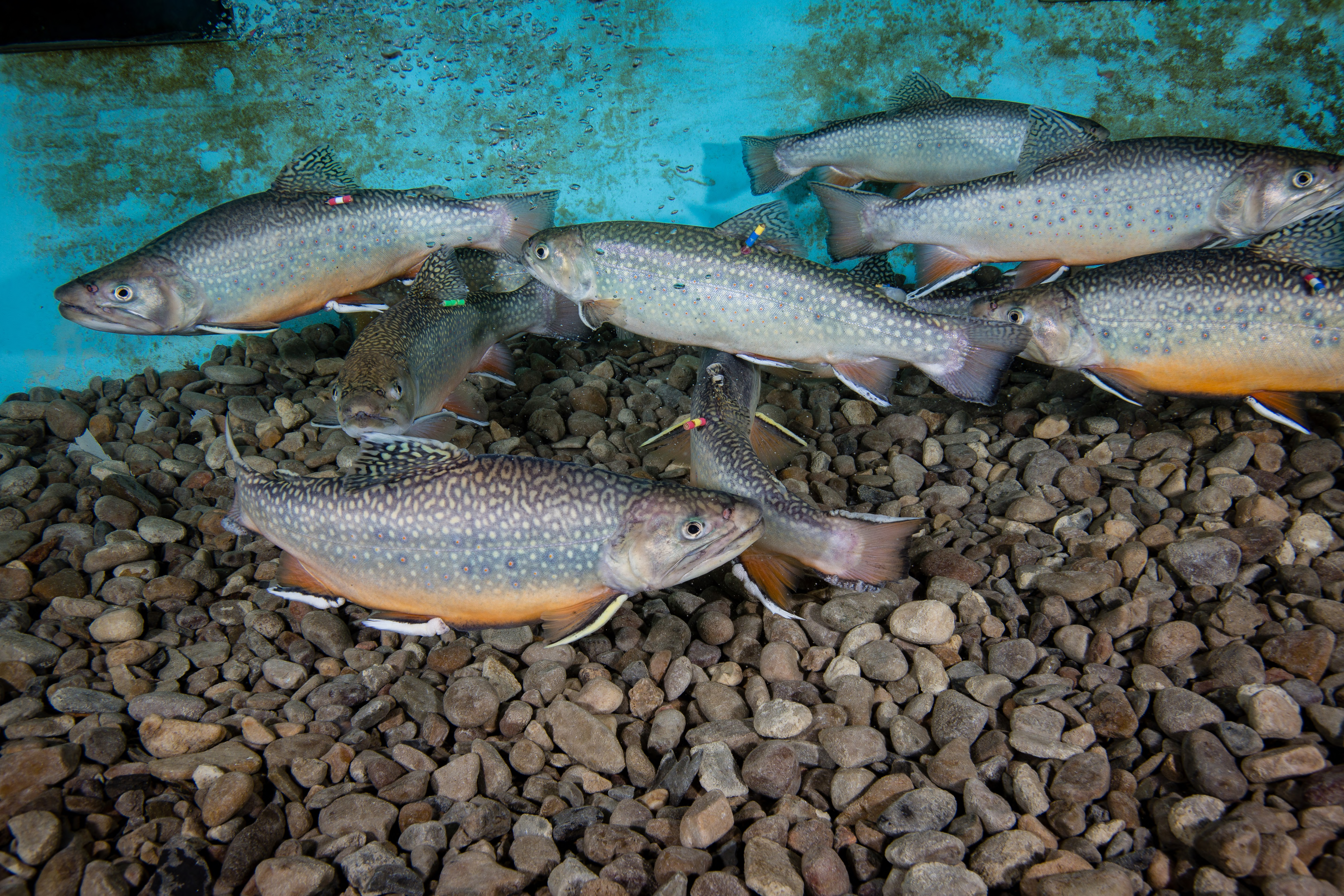 Brook trout are members of the char subgroup of the salmon family (Salmonidae) which also includes the Arctic char, bull trout, Dolly Varden and lake trout. Char are distinguished from other trout and salmon species by the absence of teeth in the roof of the mouth, the presence of light colored spots on a dark colored body, their smaller scales, and differences in skeletal structure
