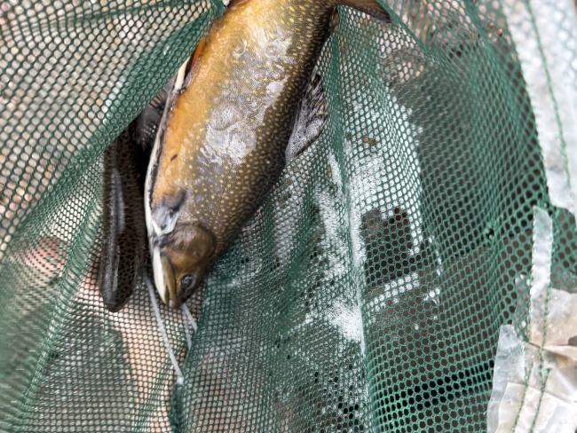 A large hatchery grown brook trout being stocked.