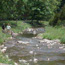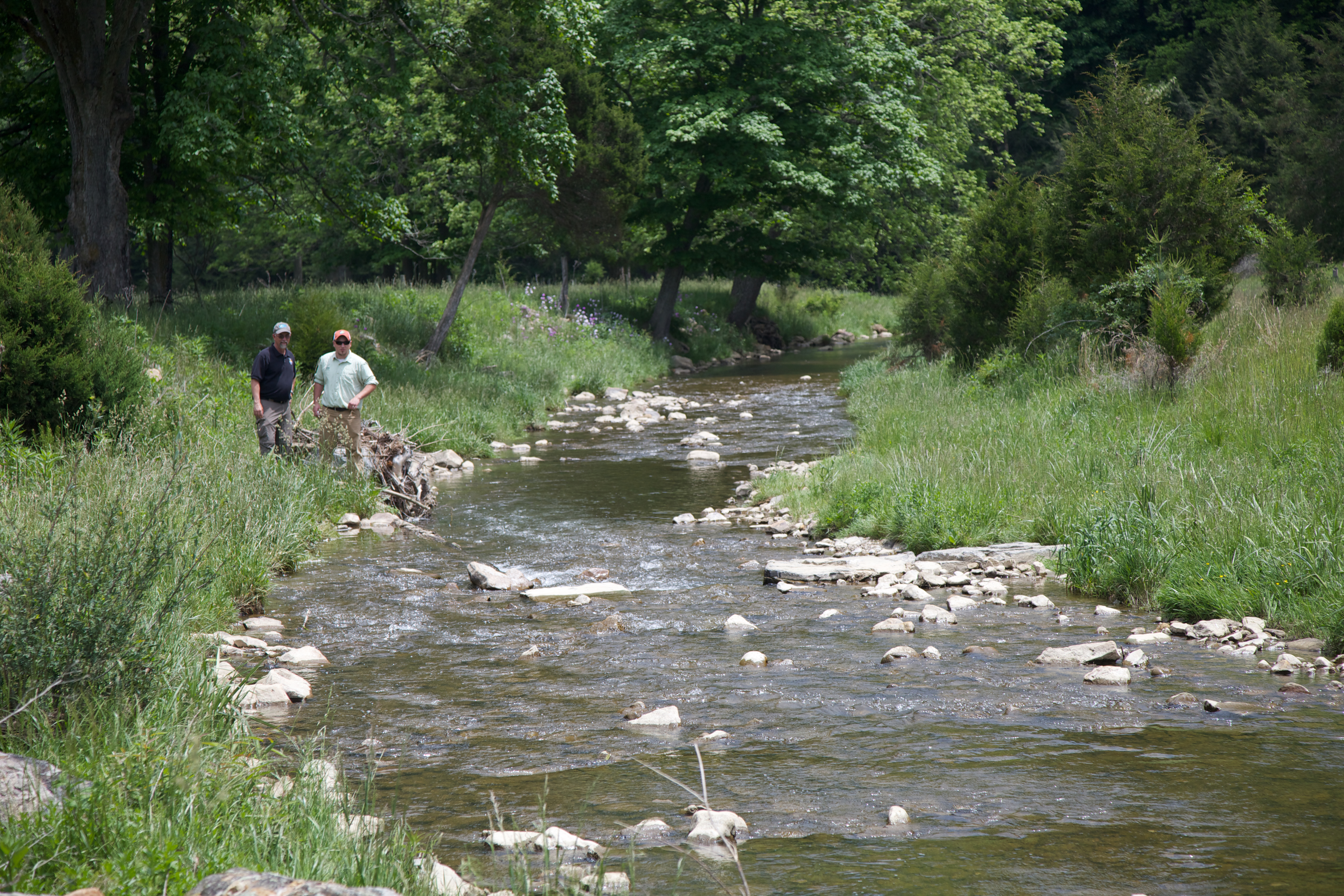 Trout Unlimited & FWS employee look at restored Brook Trout stream on private land.