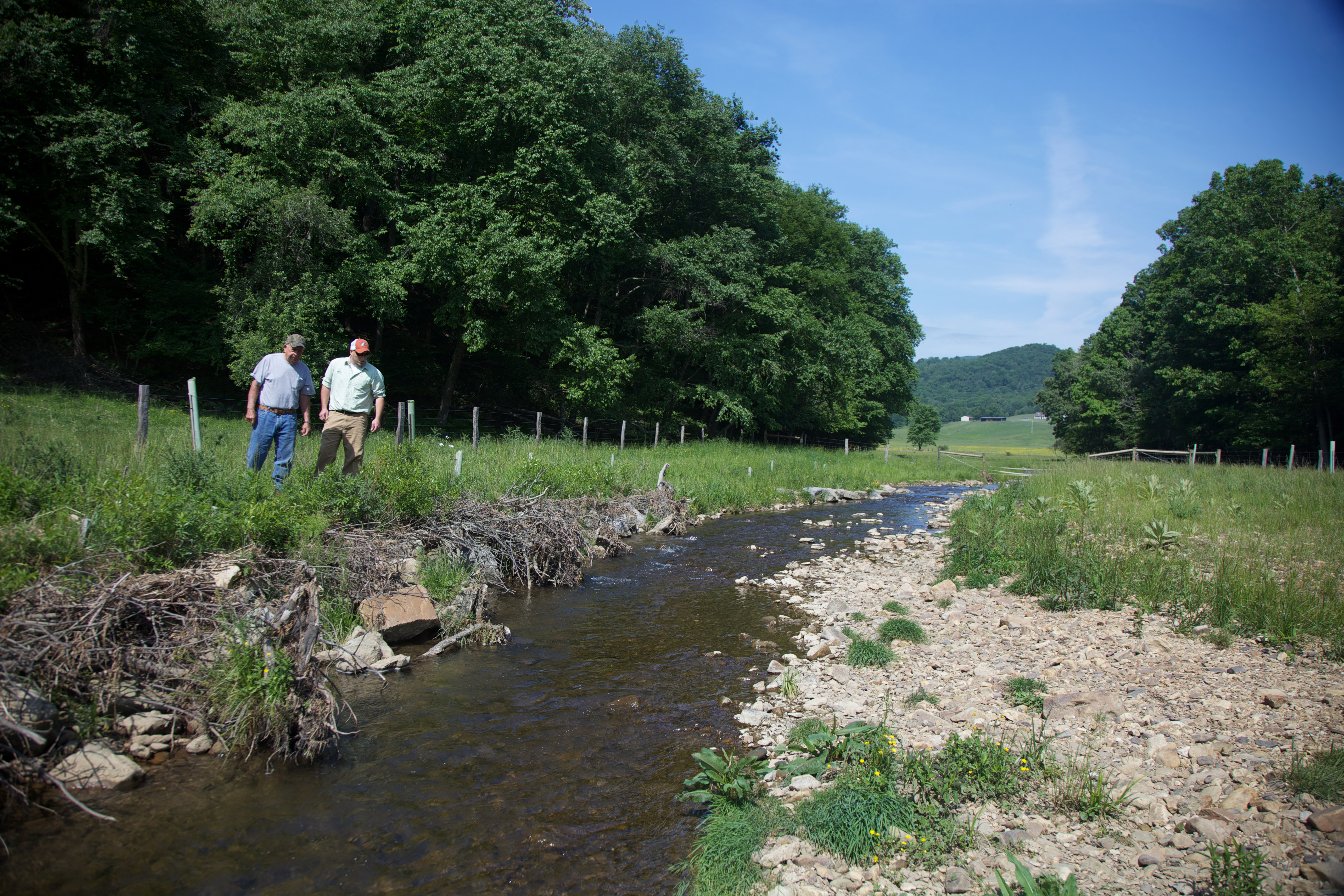 Trout Unlimited and landowner look at restored Brook Trout stream and habitat around the stream.