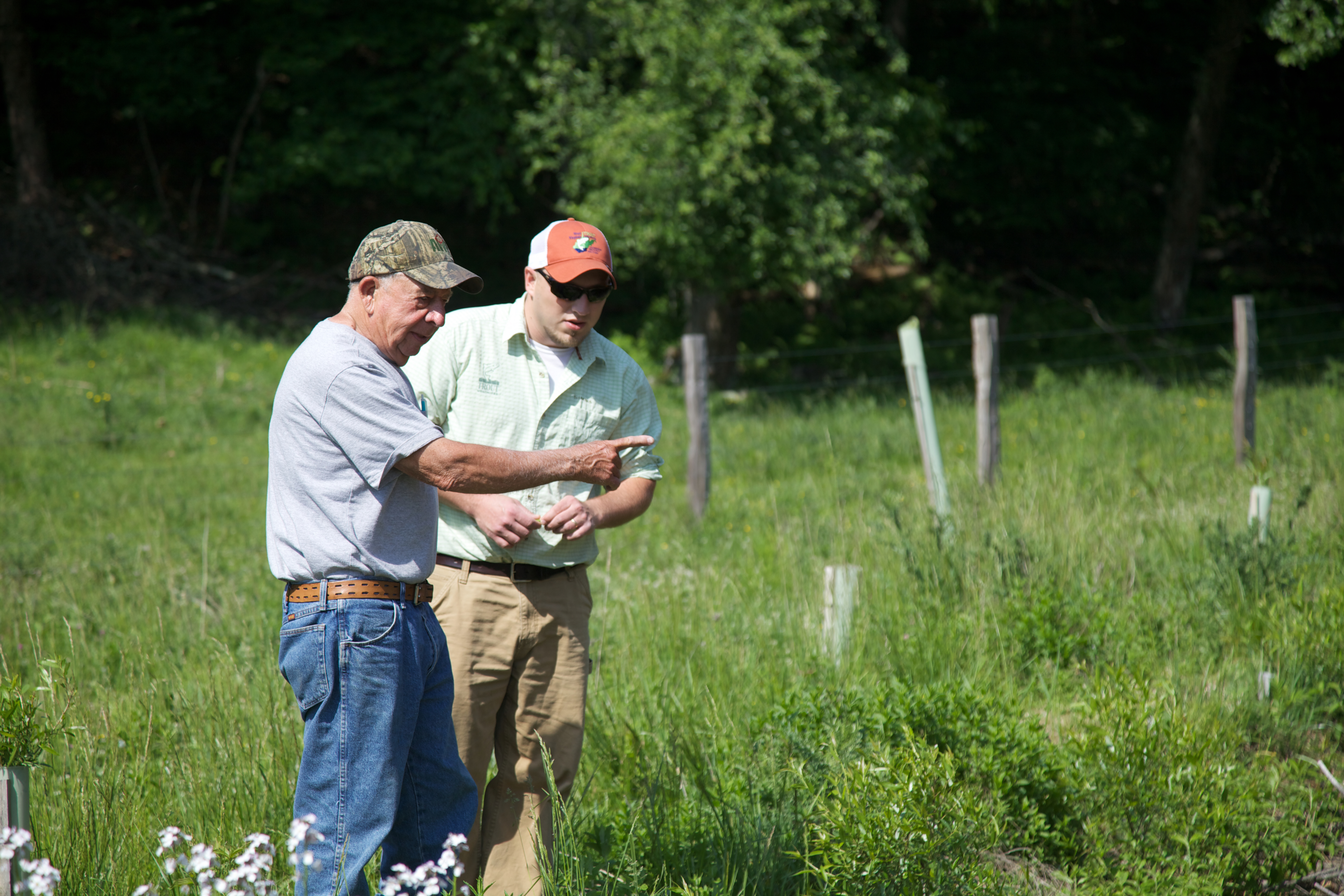 Landowner discussing the stream restoration with a Trout Unlimited employee.