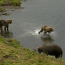Grizzly bears standing in river at the Kodiak National Wildlife Refuge. One adolescent is running through the water.